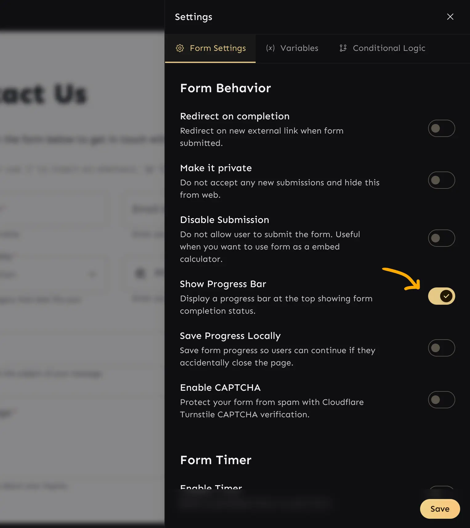 - Enable the Progress BarUnder the Form Behavior section, find Show Progress Bar.Toggle the switch ON.