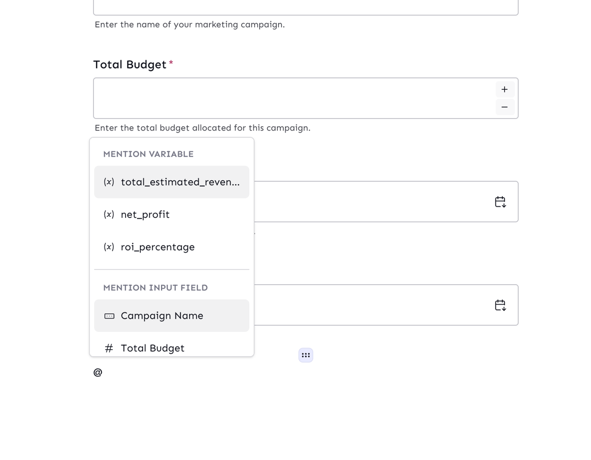 Mentions allow you to reference variables or field values anywhere in your form using the @ symbol. This creates dynamic content that updates automatically.