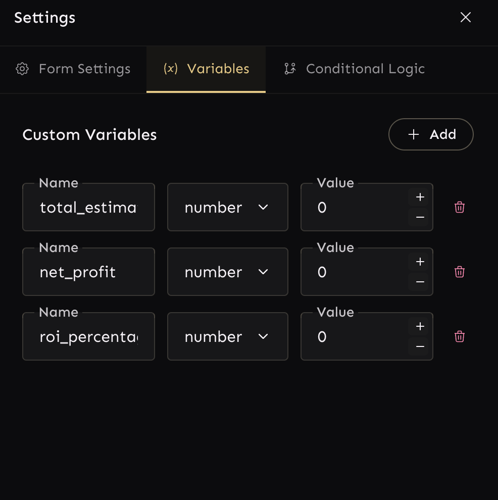 Click on gear icon in the editor header which open a sidebar. There you’ll see two tabs : Form Settings, Variables and Conditional Logic