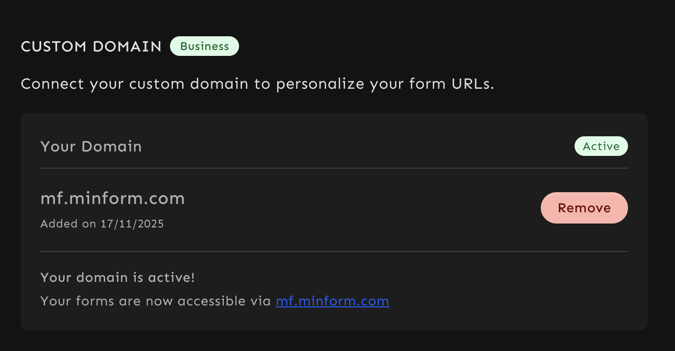 Custom domains allow you to serve your forms from your own domain (e.g., forms.yourcompany.com) instead of minform.io. This provides a fully white-labeled experience for your users.